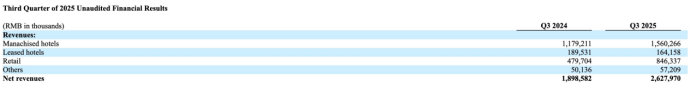 截至2025年第三季度,亚朵酒店网络在运营酒店数量达1948家,客房总数达219359间,酒店数量和客房数量同比分别快速增长27.1%和25.2%,其中,加盟酒店数量达到1924家,还有754家管理加盟酒店正在开发中。