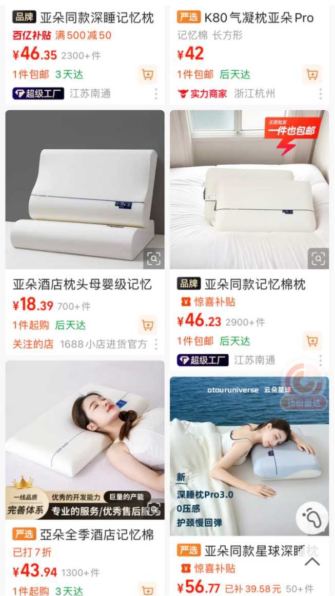 更不用说,在各大电商平台,无数白牌工厂推出的“亚朵同款”“平替”产品,以不到百元的价格蚕食着市场。当“亚朵星球”不得不陷入与这些产品比拼性价比的境地时,其高溢价的商业模式或将难以为继。