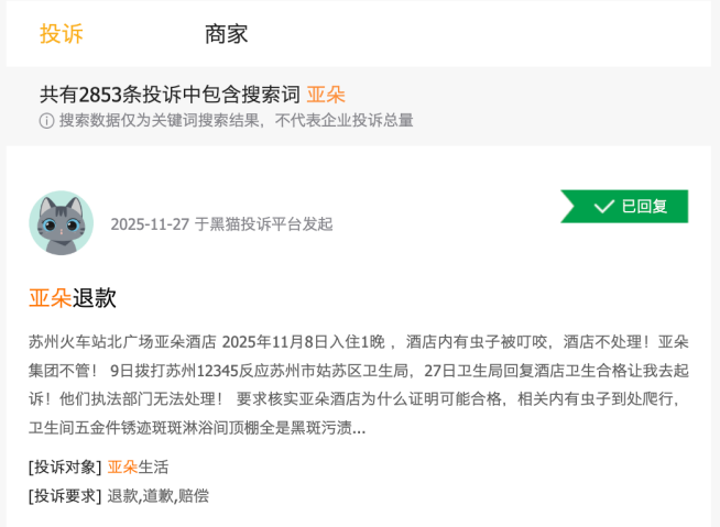 在黑猫投诉平台上,以“亚朵”为关键词,更有多达千余条投诉,卫生差劲、服务滞后、隐私泄露等问题是重灾区。