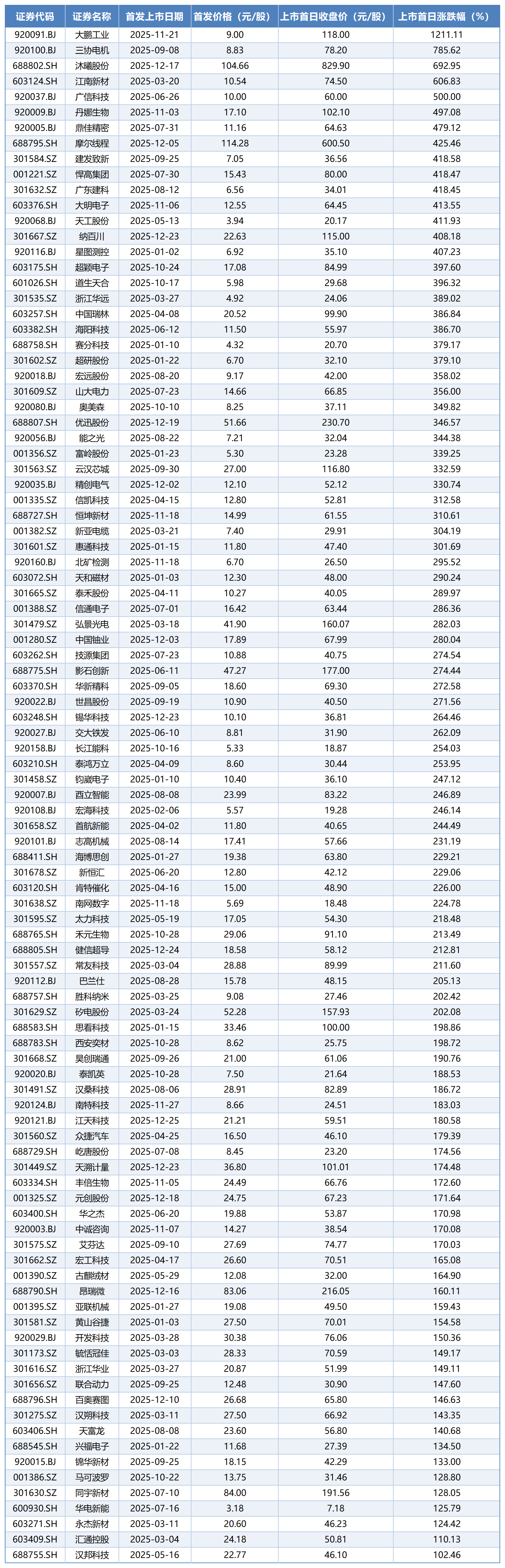 首日涨幅排名前五的公司分别是大鹏工业、三协电机、沐曦股份、江南新材、广信科技,首日涨幅分别为1211.11%、785.62%、692.95%、606.83%、500.00%。