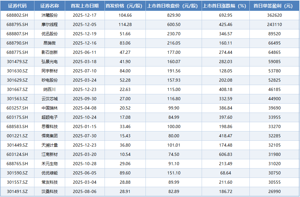 “肉签”排行榜上,沐曦股份(688802.SH)中一签可盈利(以上市首日收盘价计算,下同)36.26万元;摩尔线程(688795.SH)、优讯股份(688807.SH)紧随其后,单签盈利分别为24.31万元、8.95万元;排在第四和第五位的分别是昂瑞微(688790.SH)、影石创新(688775.SH),单签盈利分别为6.65万元、6.49万元。