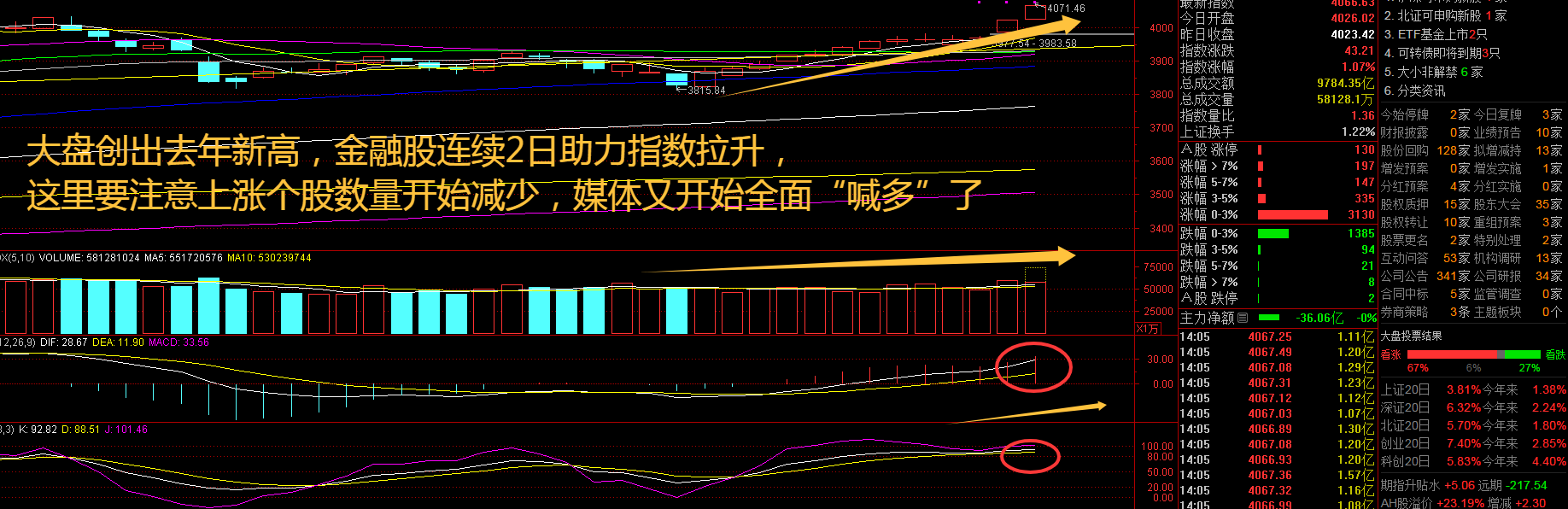 上证指数周二高开高走,出现明显的上攻形态,金融股助推指数再创去年新高,指数行情依旧,但是上涨个股数量比昨天明显变少。2025年年报披露尚未启幕,一批A股公司已率先释放业绩“暖意”。截至2026年1月5日20时,已有超40家A股公司预告2025年度业绩同比增长。分行业来看,电子、机械设备、基础化工、医药生物等行业公司发布业绩预增公告较多。接下来注意上证指数能否在4070点之上稳住。