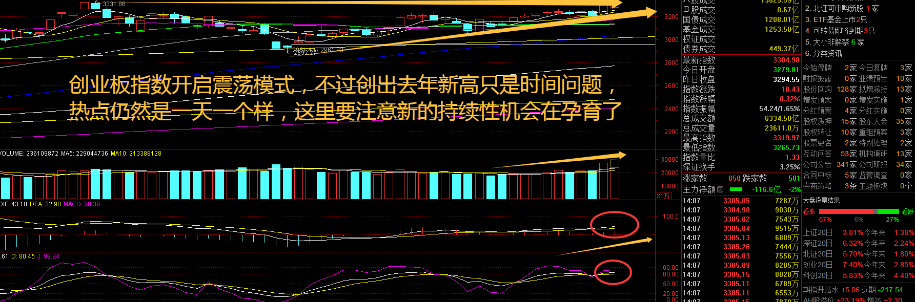 创业板指数周二出现明显调整走势,这里要注意真正的“聪明资金”开始收割了,切莫被“喊口号”冲昏了头脑。外部环境依然存在不确定性,并对风险偏好产生扰动。不过,考虑到政策端“巩固资本市场回稳向好势头”的要求,市场的下行风险也将受控,因而指数或整体延续震荡态势。接下来注意创业板指数能否在3330点之上稳住。