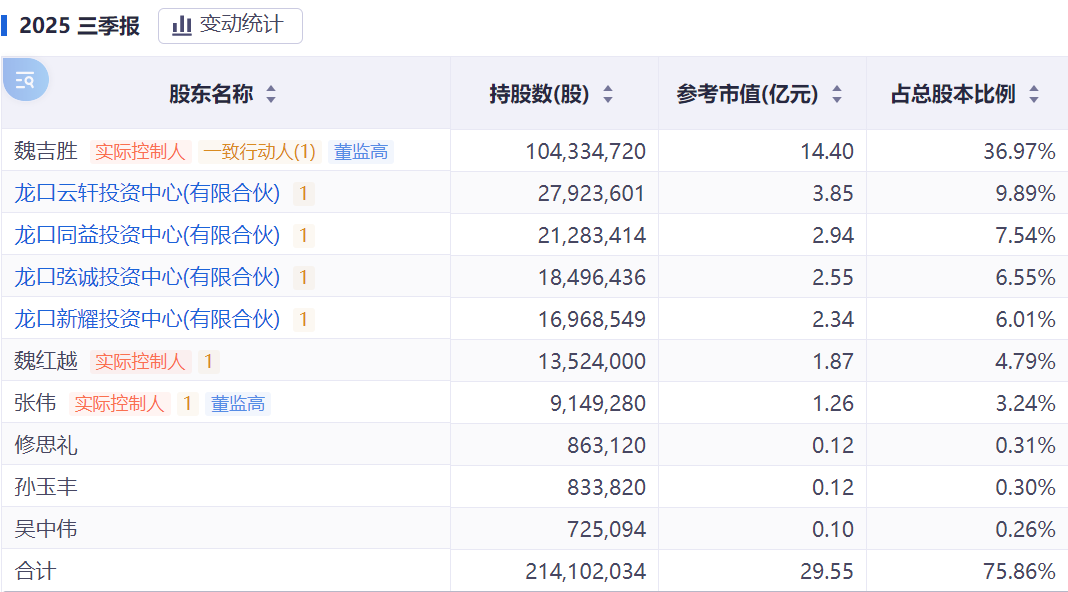 截至2025年三季度末,魏吉胜直接持股36.97%,并通过龙口云轩、龙口同益、龙口弦诚、龙口新耀四家员工持股平台间接控制大量股份。