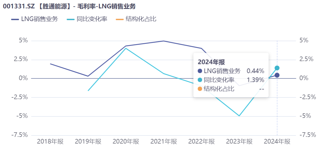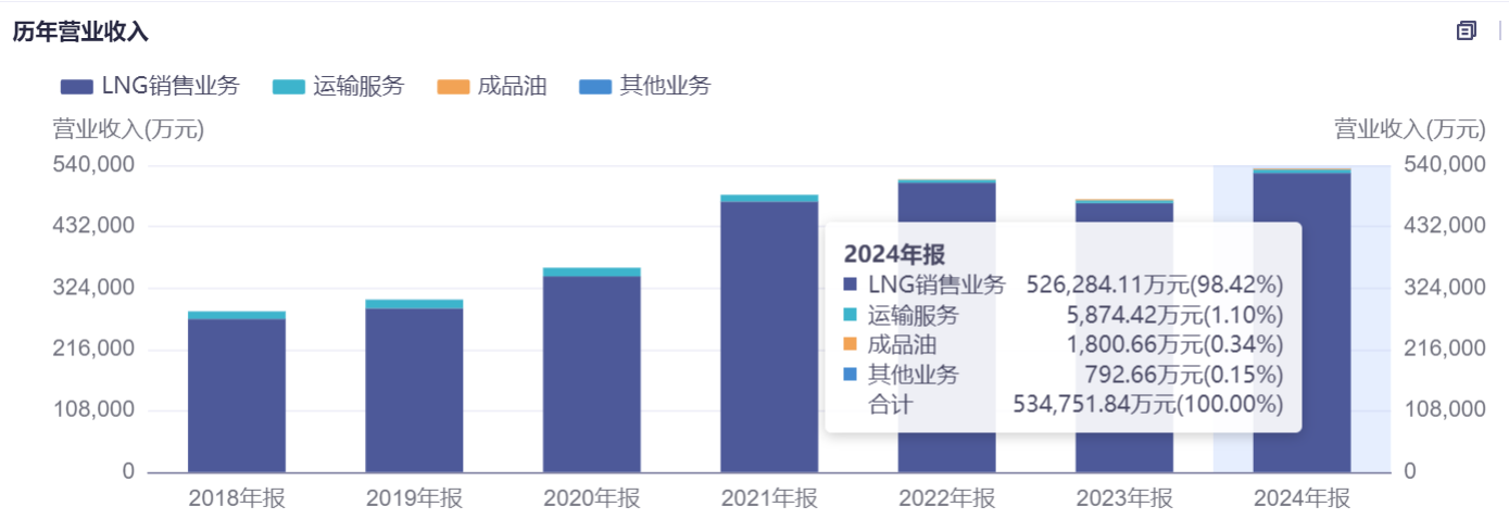目前,胜通能源营业收入高度集中于LNG销售,占总收入98%以上,业务模式主要为赚取购销价差。此外,公司还提供少量的运输服务。