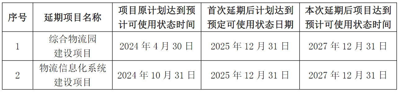 2025年12月25日,胜通能源召开第三届董事会第七次会议,审议通过了《关于部分募投项目重新论证并再次延期的议案》。根据目前募集资金投资项目实际进展情况,同意将公司首次公开发行股票募集资金投资项目“综合物流园建设项目”和“物流信息化系统建设项目”达到预计可使用状态日期延期至2027年12月31日。