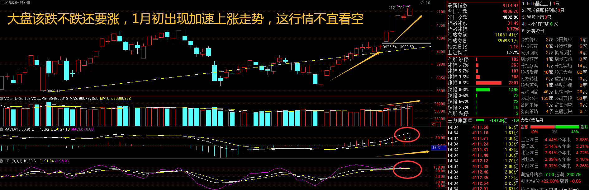 现阶段进入到指数持续逼空的行情中,势已经造起来了,就看量能是否跟上,重回3万亿元的峰值,才会迎来新一轮的持续上涨行情。现在场内资金分歧比较大,每日都会出现大量的资金流进流出,个股涨停的数量也比4季度行情明显提升很多。随着外围金融市场不断新高的行情影响下,A股市场势必会继续表演春躁行情,这个位置不宜看空跟上局势看多为上策。