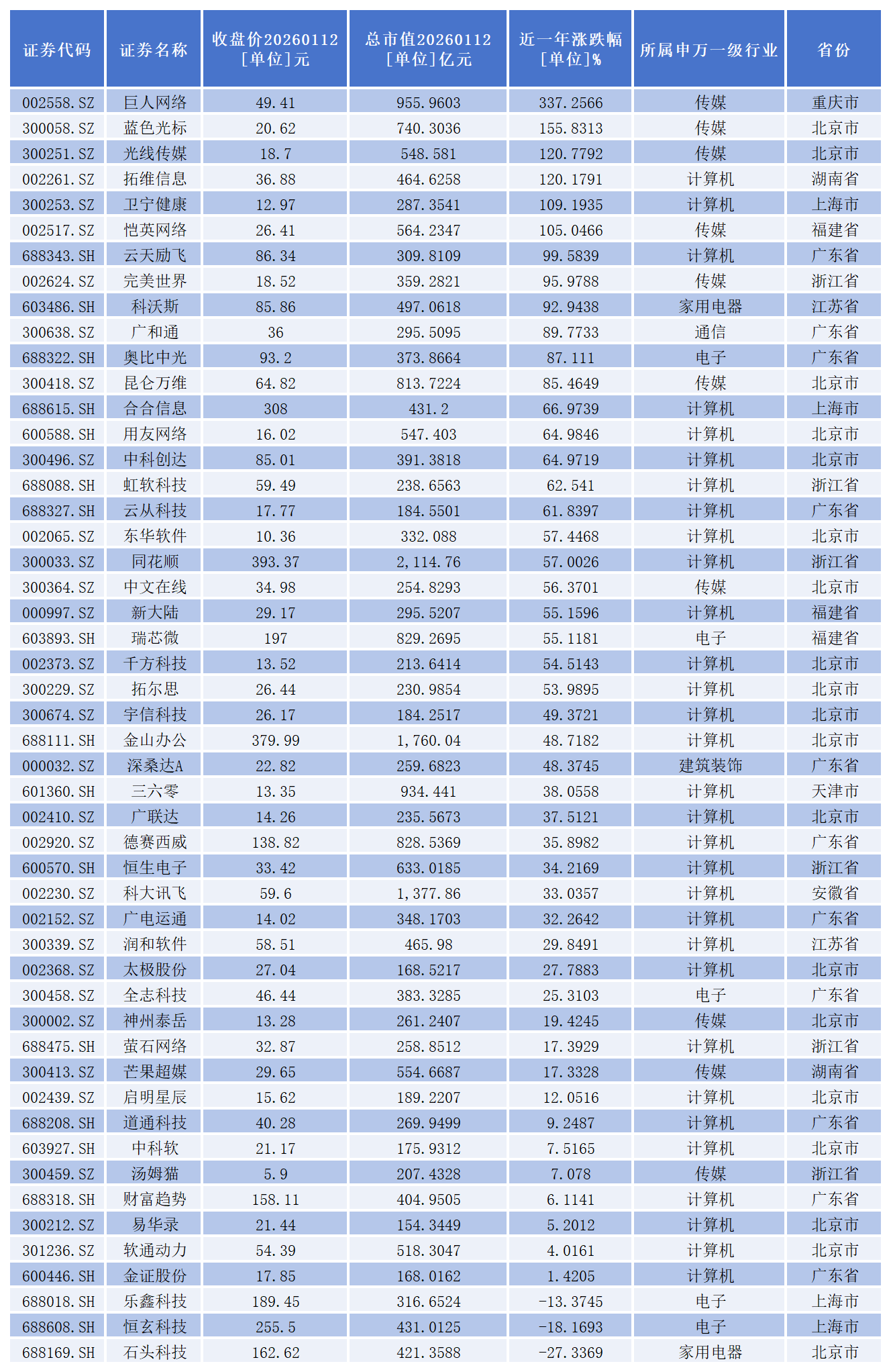 从二级市场走势看,截止1月12日收盘,近一年来,一共有47家公司股价出现上涨。其中,巨人网络、蓝色光标、光线传媒、拓维信息、卫宁健康、恺英网络6家公司股价已经实现**。