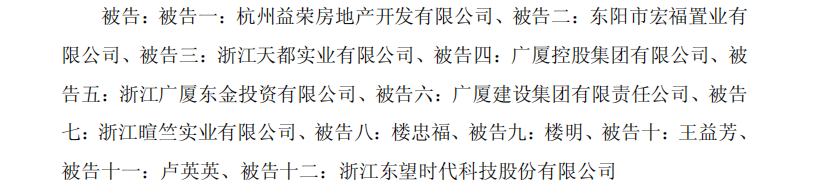 据了解,东望时代的担保历史涉及多起重大案件,覆盖广厦控股及其关联方、子公司、外部企业等,金额从数千万至数十亿元不等,部分案件已进入司法程序并造成资产冻结、划扣。