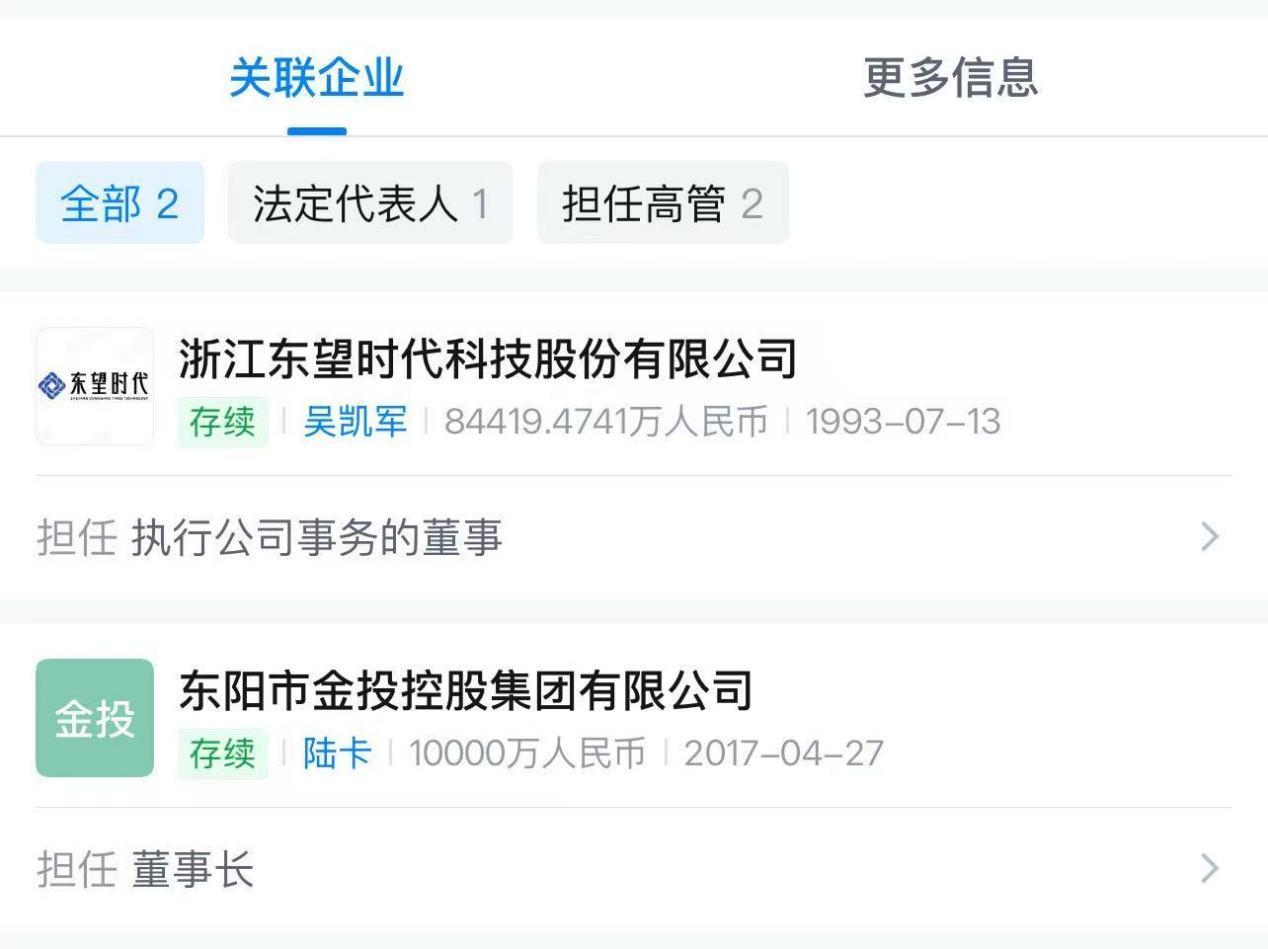东望时代的董事长吴凯军先生,同时兼任东阳金投的董事长。根据《上海证券交易所股票上市规则》,金投投资因“董监高交叉任职” 被认定为东望时代的关联法人。