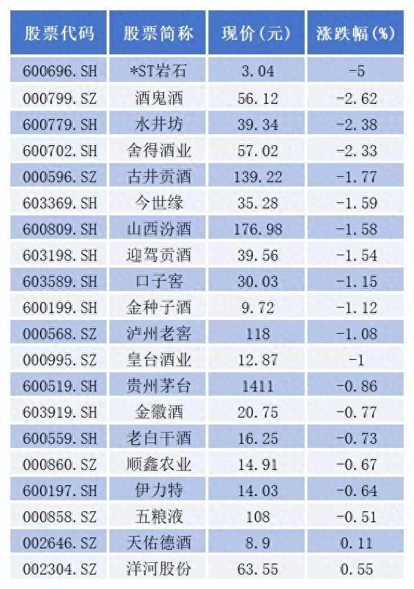 截至收盘,20只个股中,除了天佑德酒(002646.SZ)、洋河股份(002304.SZ)小幅上涨,其余18只个股均出现不同程度下跌,*ST岩石(600696.SH)跌幅达5%。