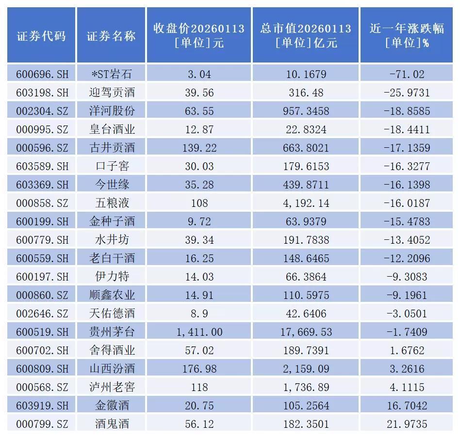 从二级市场表现看,截至1月13日收盘,近一年来,20只白酒股中有15只股价出现跌幅,占比高达75%。