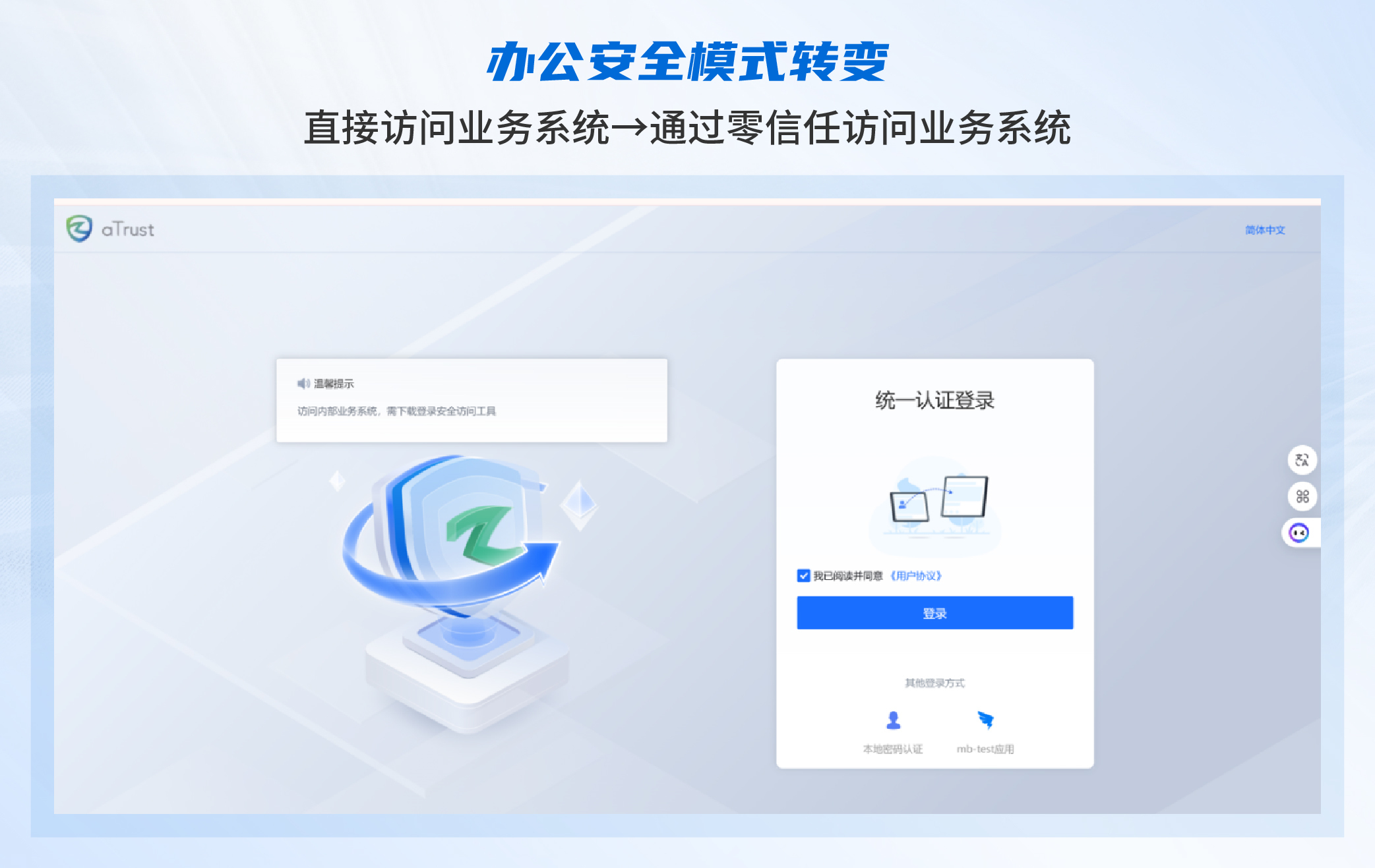 不同于“一次认证,全网开放”的传统模式,零信任aTrust坚持“从不信任,始终验证”,对每一次访问请求都进行多维度动态校验。只有合法用户通过可信终端,在安全网络环境下,才能访问被授权的应用,而非开放整个内网权限。