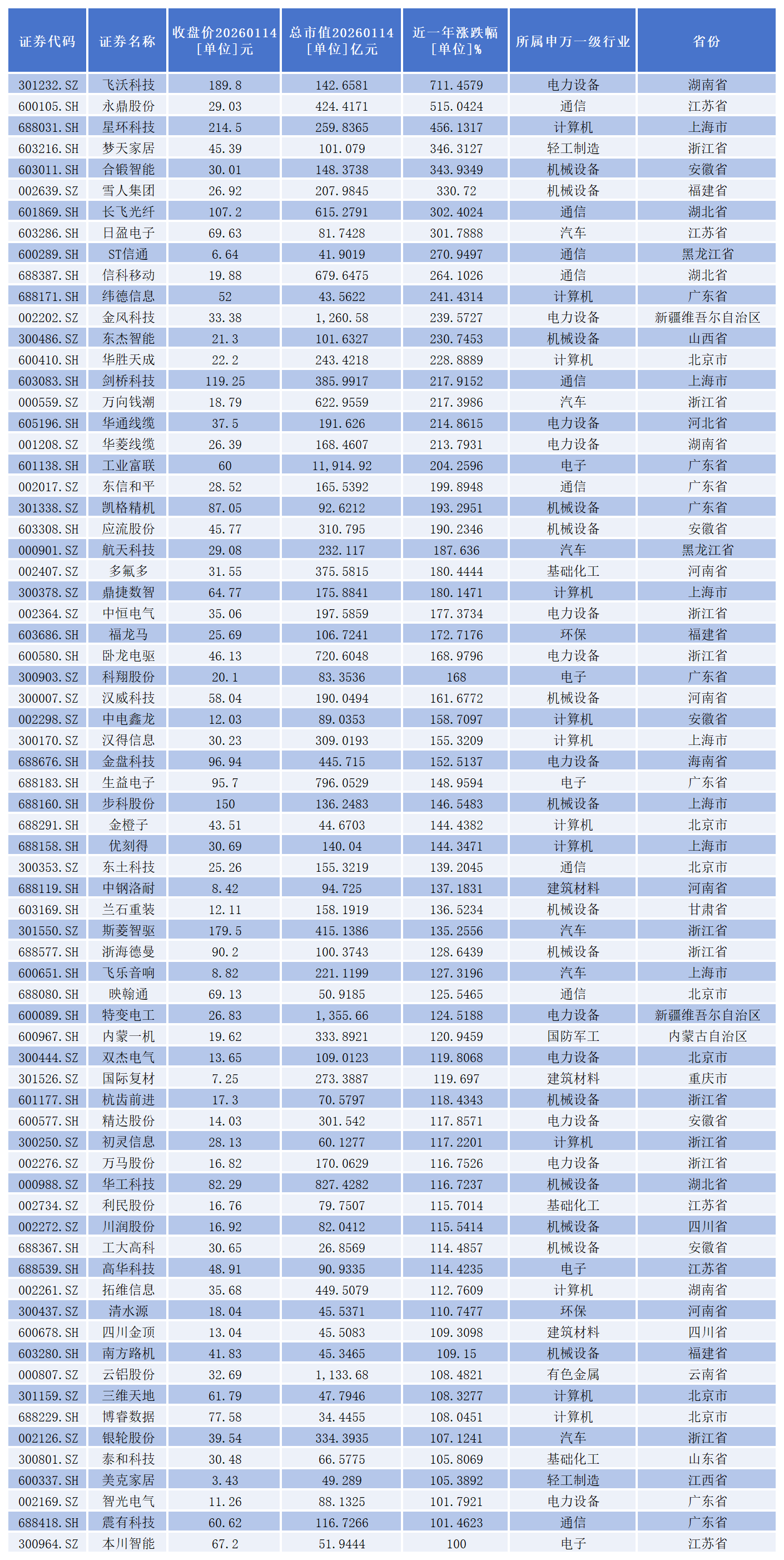 70只个股一年涨幅**