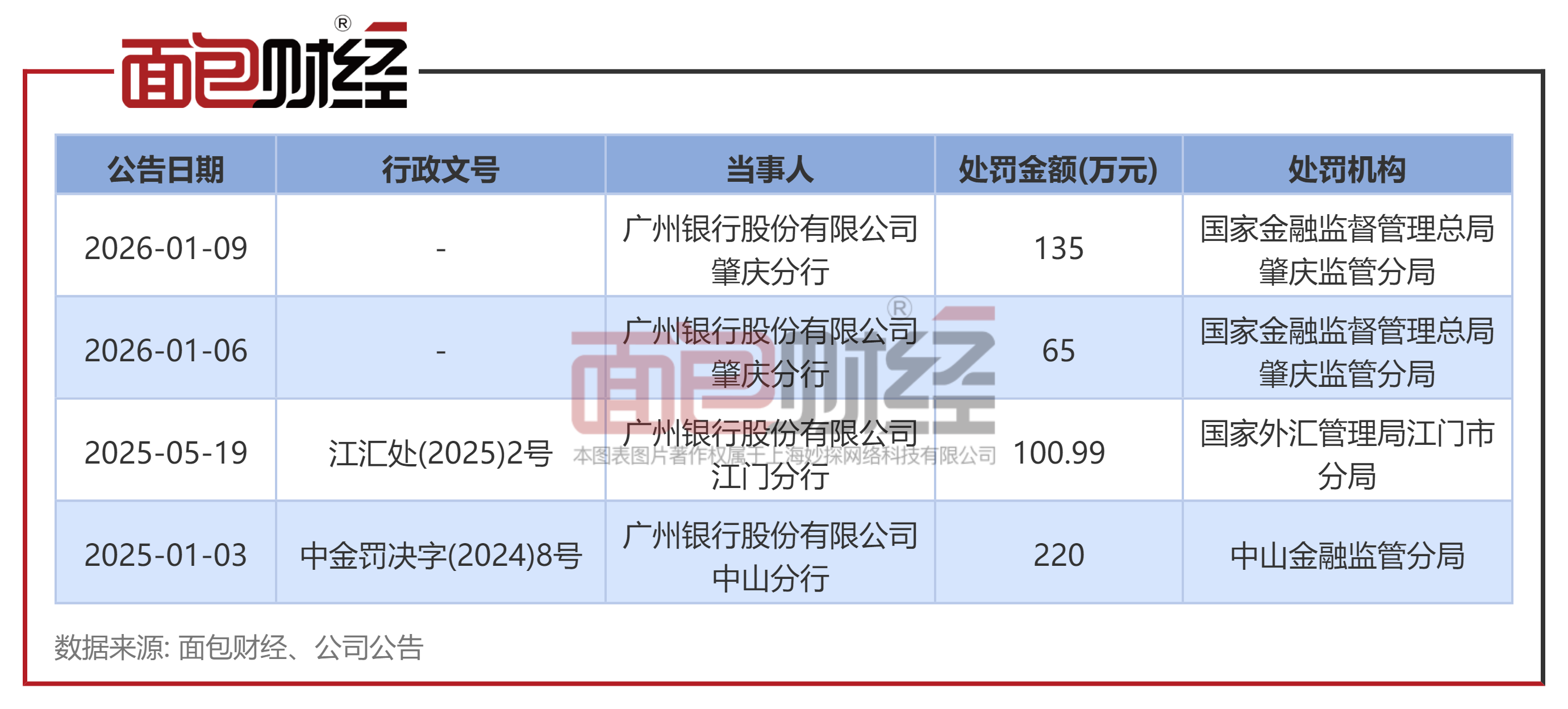 近日,国家金融监督管理总局肇庆监管分局披露了对广州银行的行政处罚, 公开信息显示,2026年1月9日,广州银行股份有限公司肇庆分行因贷款管理不到位,被罚款135万元。