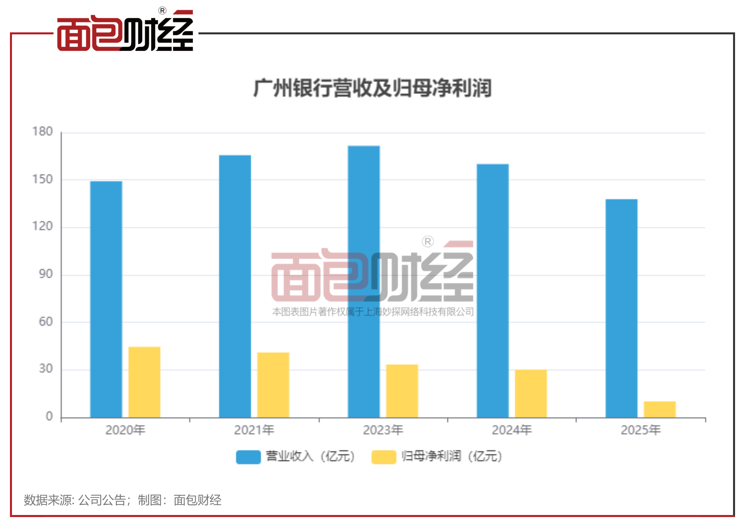 从具体数据来看,广州银行的归母净利润由2021年的41.01亿元,降至2024年度的10.12亿元,营收由同期的165.64亿元降至137.85亿元。