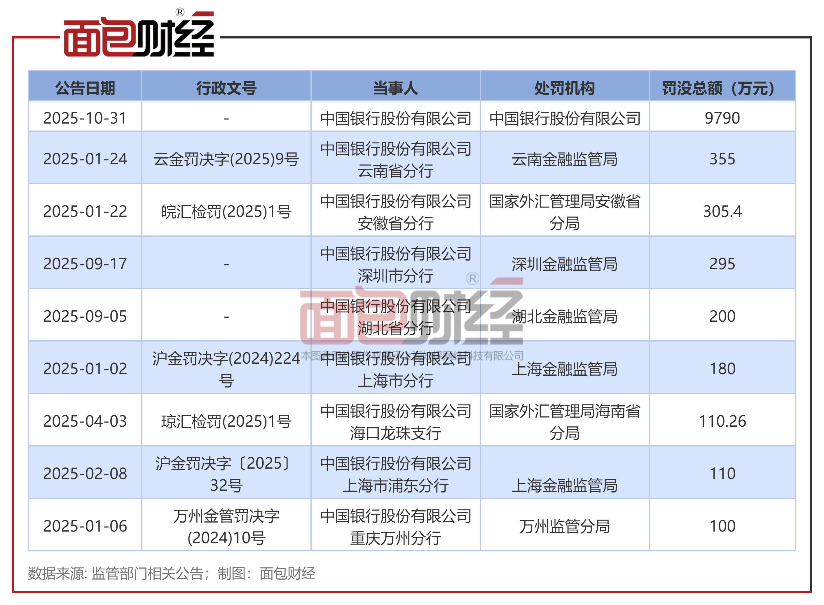 国家金融监督管理总局行政处罚信息公示列表显示,2025年10月31日,中国银行股份有限公司因相关公司治理、贷款、同业、票据、资产质量、不良资产处置等业务管理不审慎,被罚款9790万元。对相关责任人员陈梓、刘伶俐、张惠娟、何春耕、余荣刚警告并罚款合计30万元。