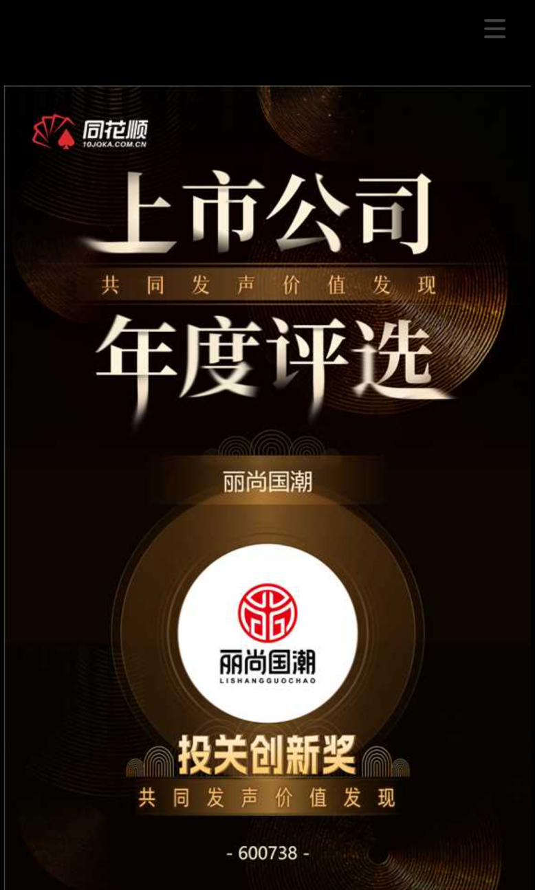 同花顺“企业号”作为上市公司与投资者之间的权威沟通平台,已吸引超过2000家上市公司入驻,“投关创新奖”即是基于各上市公司企业号数据、IR活动、个股及话题热度等多维度数据综合评定出获奖公司,丽尚国潮在激烈竞争中脱颖而出,不仅彰显了广大投资者对公司业务韧性、治理水平与长期价值的认可,也反映出公司在构建高效、透明、互动型投资者沟通机制方面的扎实成果。