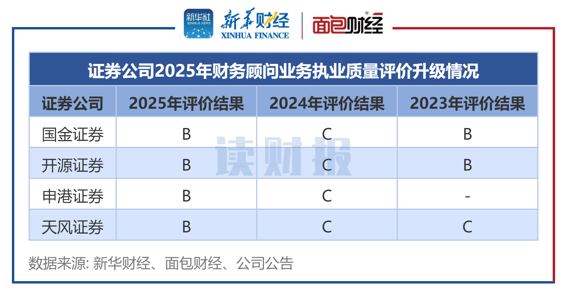 2025年度的考评结果中,有4家证券公司的财务顾问业务执业质量评价结果较上一年升级。