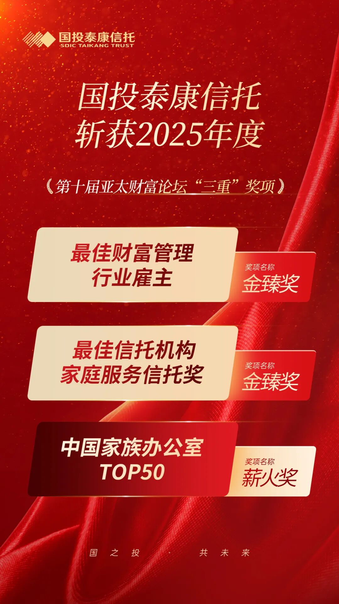 至此,国投泰康信托实现了亚太财富管理论坛重磅奖项大满贯,在财富管理、资产管理、家族信托、家庭服务信托、慈善信托等业务领域彰显转型成效。