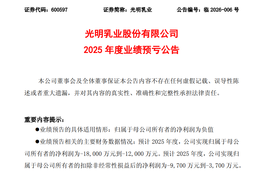 [摘要] 1月20日,光明乳业(600597.SH)发布了2025年度业绩预亏公告。公告显示,预计2025年度公司实现归属于母公司所有者的净利润为-18,000万元至-12,000万元,与上年同期相比将出现亏损。