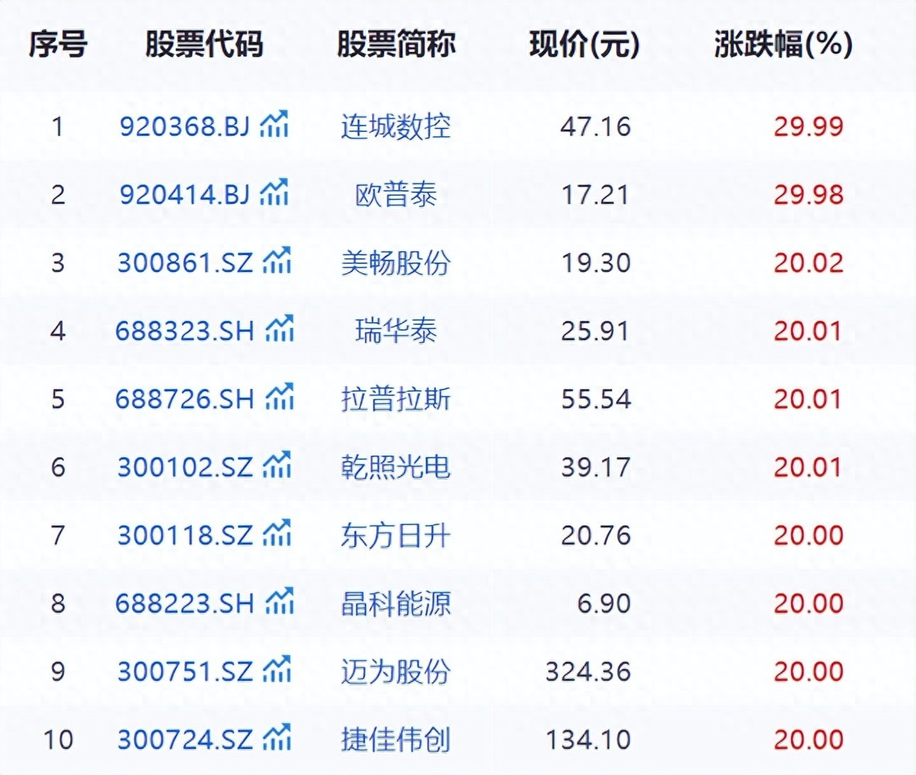 截至收盘,连城数控(920368.BJ)、欧普泰(920414.BJ)、美畅股份(300861.SZ)、瑞华泰(688323.SH)、拉普拉斯(688726.SH)、乾照光电(300102.SZ)、晶科能源(688223.SH)、琏升科技(300051.SZ)、东方日升(300118.SZ)、捷佳伟创(300724.SZ)、迈为股份(300751.SZ)、爱旭股份(600732.SH)、江苏有线(600959.SH)、正泰电源(002150.SZ)、钧达股份(002865.SZ)、鑫铂股份(003038.SZ)等30余只概念股批量涨停。