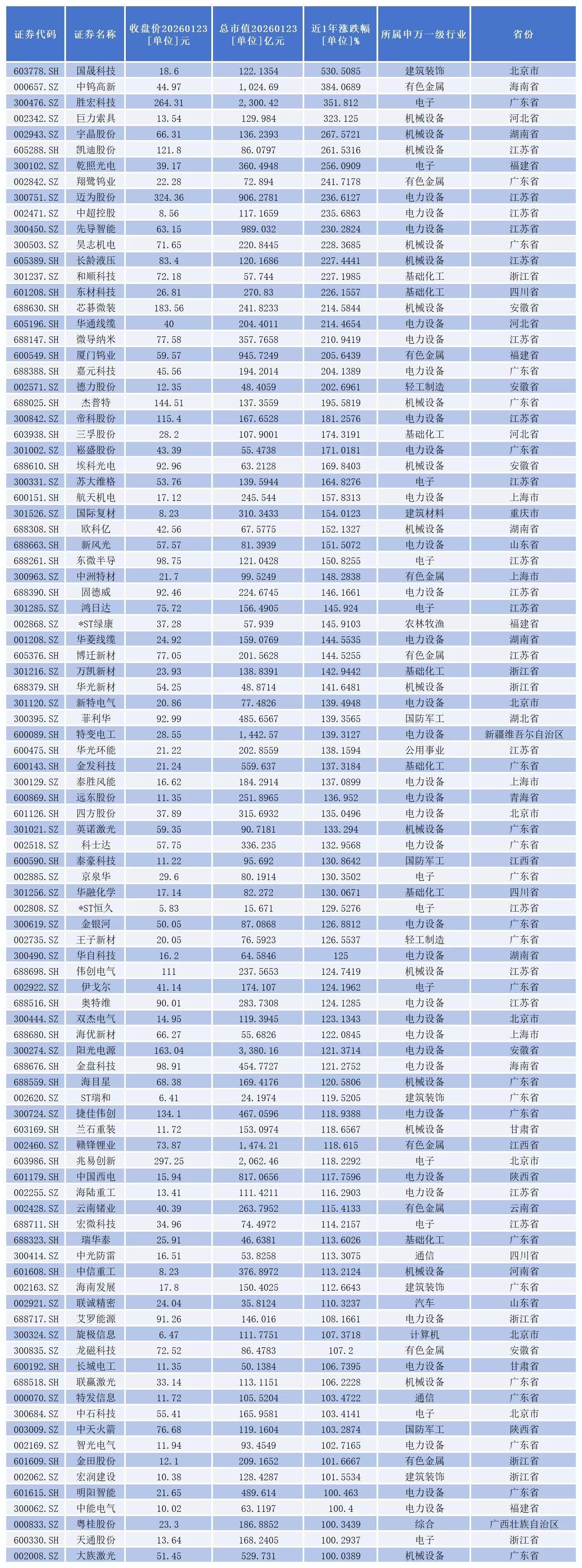 其中,国晟科技、中钨高新、胜宏科技、巨力索具、宇晶股份、凯迪股份、乾照光电、翔鹭钨业、迈为股份、中超控股、先导智能、昊志机电、长龄液压、和顺科技、东材科技、芯碁微装、华通线缆、微导纳米、厦门钨业、嘉元科技、德力股份等21家公司股价涨幅超200%。