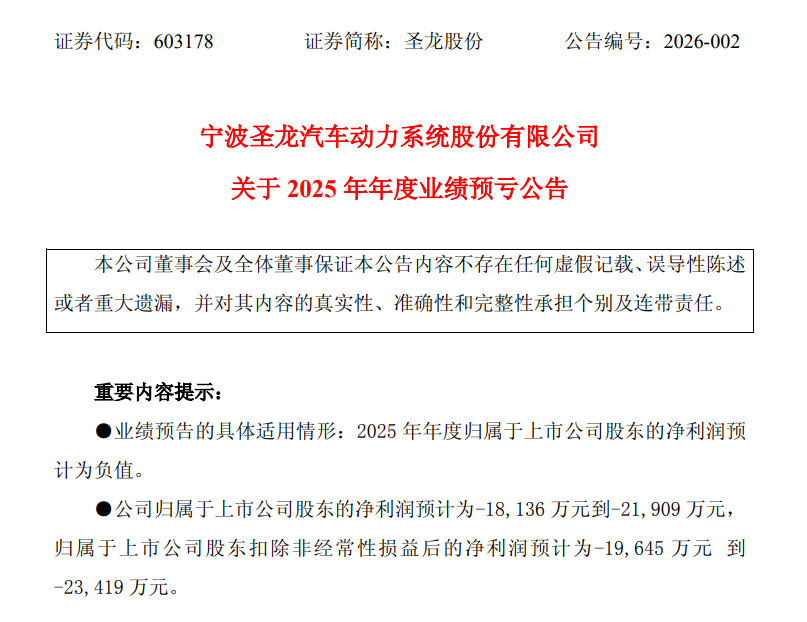 [摘要] 1月23日,圣龙股份(603178.SH)发布2025年年度业绩预亏公告,经财务部门初步测算,公司2025年年度将出现亏损,归属于上市公司股东的净利润预计为-1.81至-2.19亿元。