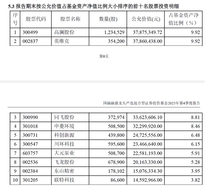 截至2025年四季度末,基金重仓股主要包括高澜股份、英维克、同飞股份、申菱环境等。相较三季度末,公司四季度末的重仓股大幅变更。