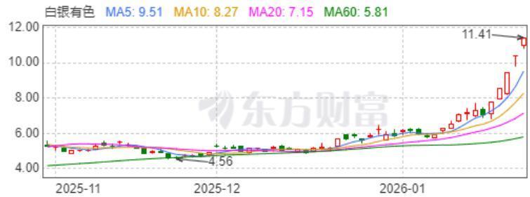 同样飞升的还有白银有色。1月26日收盘,白银有色涨10.03%,报收11.41元,今日最高价创近一年新高。这也是其近期连续第五个涨停板。
