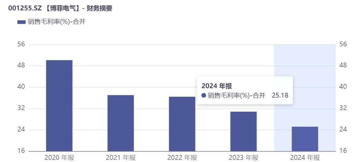 近年来,博菲电气经营业绩波动明显,且存在持续下滑的风险。2022年、2023年、2024年、2025年上半年,公司扣除非经常性损益后归属于母公司普通股股东的净利润分别为6,268.38万元、2,886.96万元、793.64万元和624.75万元;综合毛利率分别为36.42%、30.83%、25.18%和31.41%。