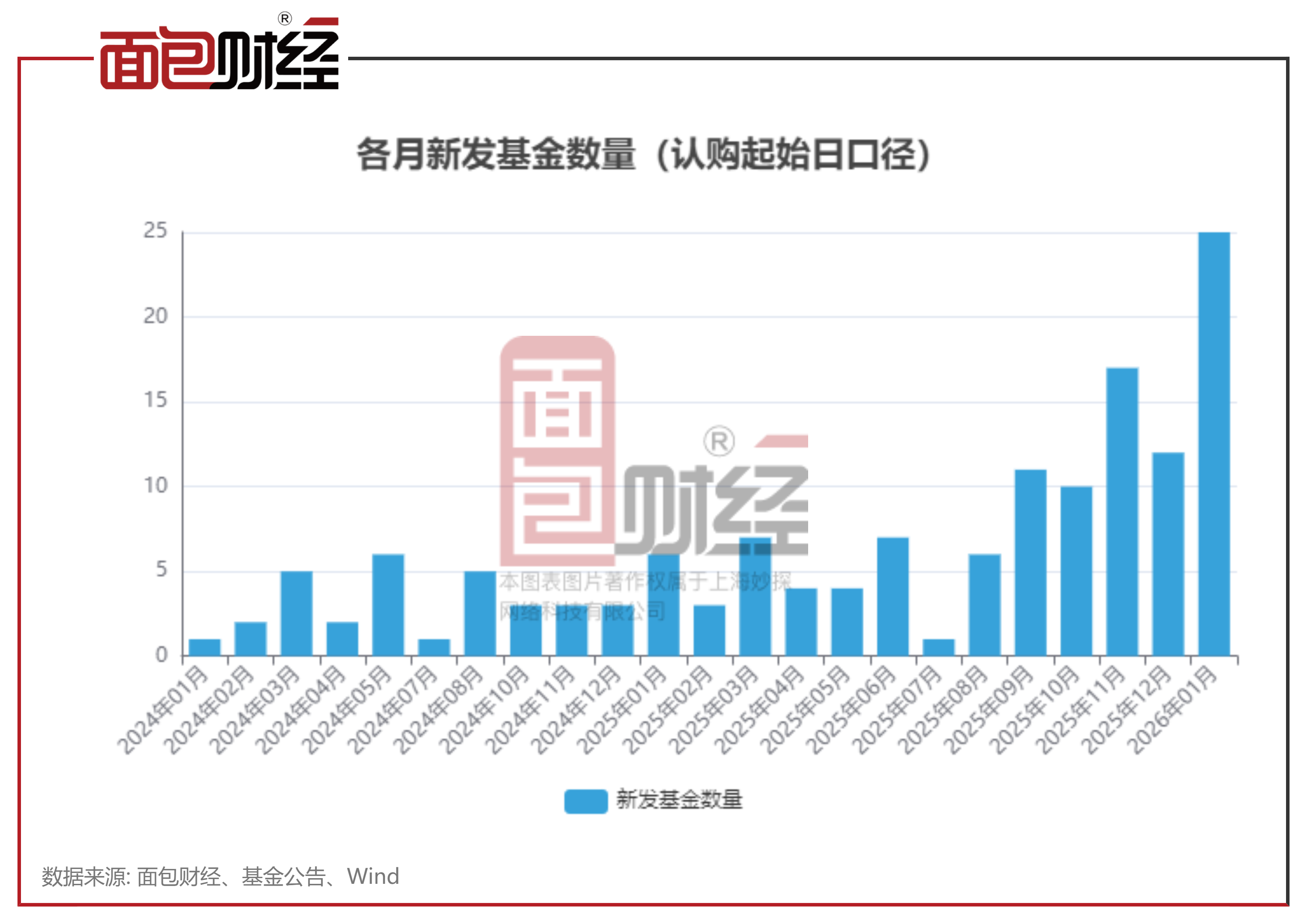 Wind数据显示,按照认购起始日口径,截至2026年1月28日披露数据,认购起始日为2026年1月的FOF基金数量达到25只,创近年来月度新高。