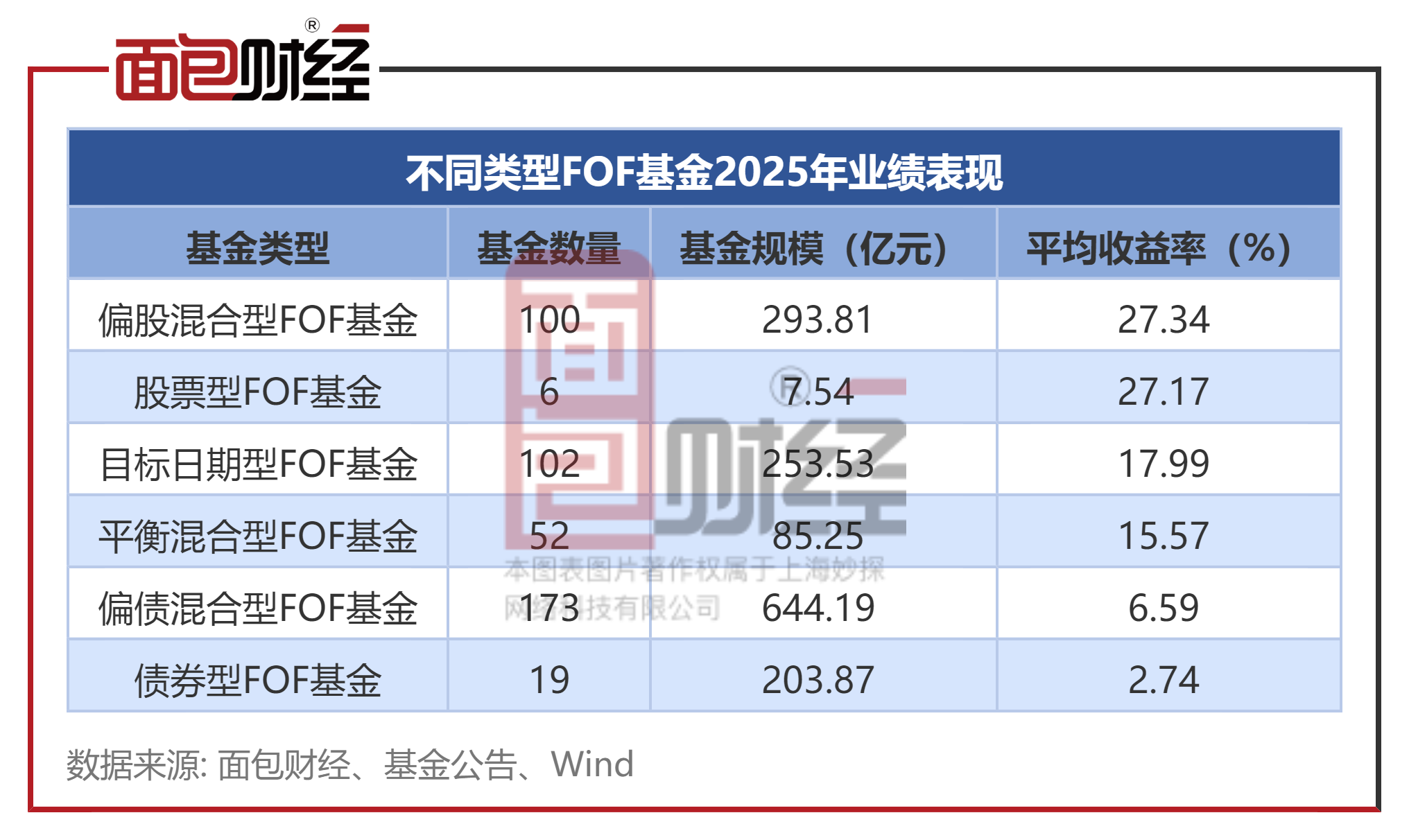 从整体业绩来看,2025年452只成立时间满一年的FOF产品全部录得正收益。其中,偏股混合型FOF基金、股票型FOF基金、目标日期型FOF基金、平衡混合型FOF基金、偏债混合型FOF基金、债券型FOF基金的平均收益率分别为27.34%、27.17%、17.99%、15.57%、6.59%、2.74%。