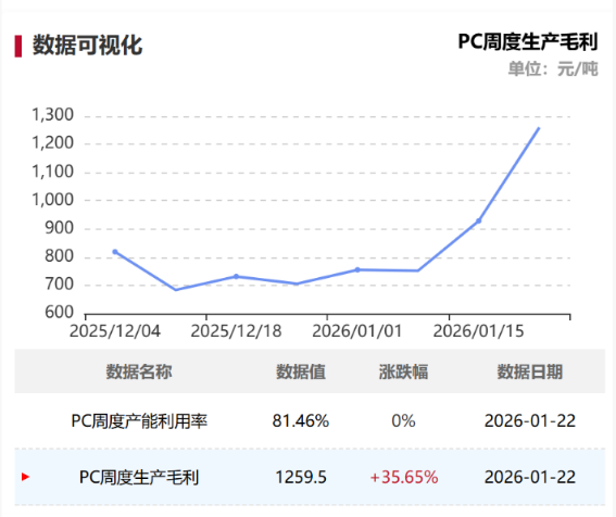2026年开年以来,PC(聚碳酸酯)产业链从上游原料到核心产品全面走强。据隆众资讯,1月26日华东注塑级低端料主流商谈参考11250-13450元/吨,中高端料商谈14700-15250元/吨,部分重心较上周五涨50-200元/吨不等。截至1月22日,PC周度生产毛利1259.5元/吨,环比涨幅达35.65%。