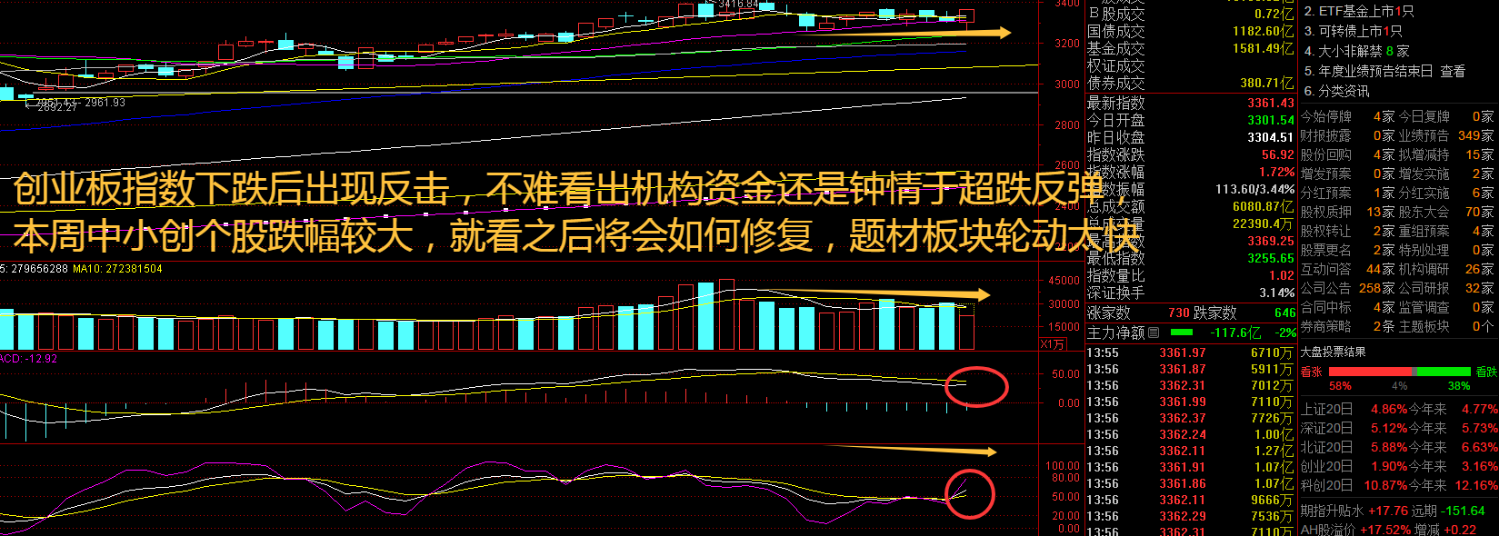 创业板指数周五在下探30日线后有所反弹,不过本周连续5日出现跌多涨少,市场行情较差。市场的震荡结构未变,即盘面上始终呈现“监管希望控制节奏,但是市场情绪难以按捺”的拉锯状态。午后注意创业板指数能否在3380点之上稳住。