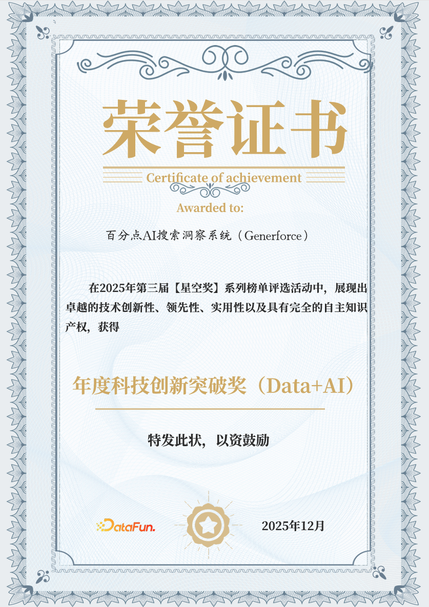 近日,DataFun第三届“星空奖”系列榜单正式揭晓,百分点科技自主研发的Generforce凭借AI智能体为核心的营销闭环能力、行业领先性与场景实用性,荣获“年度科技创新突破奖(Data+AI)”。