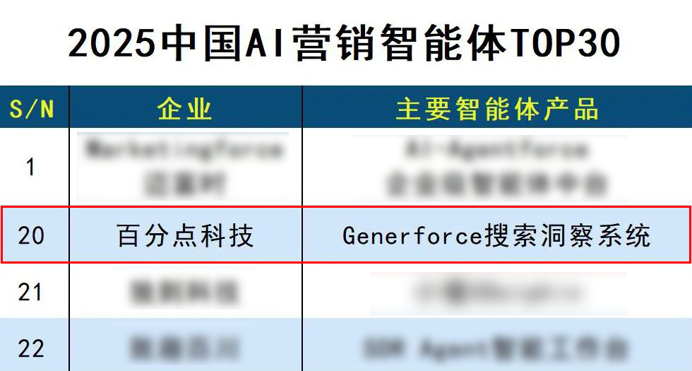 此外,德本咨询近期发布“2025中国AI营销智能体TOP30”榜单,百分点科技Generforce实力入选。