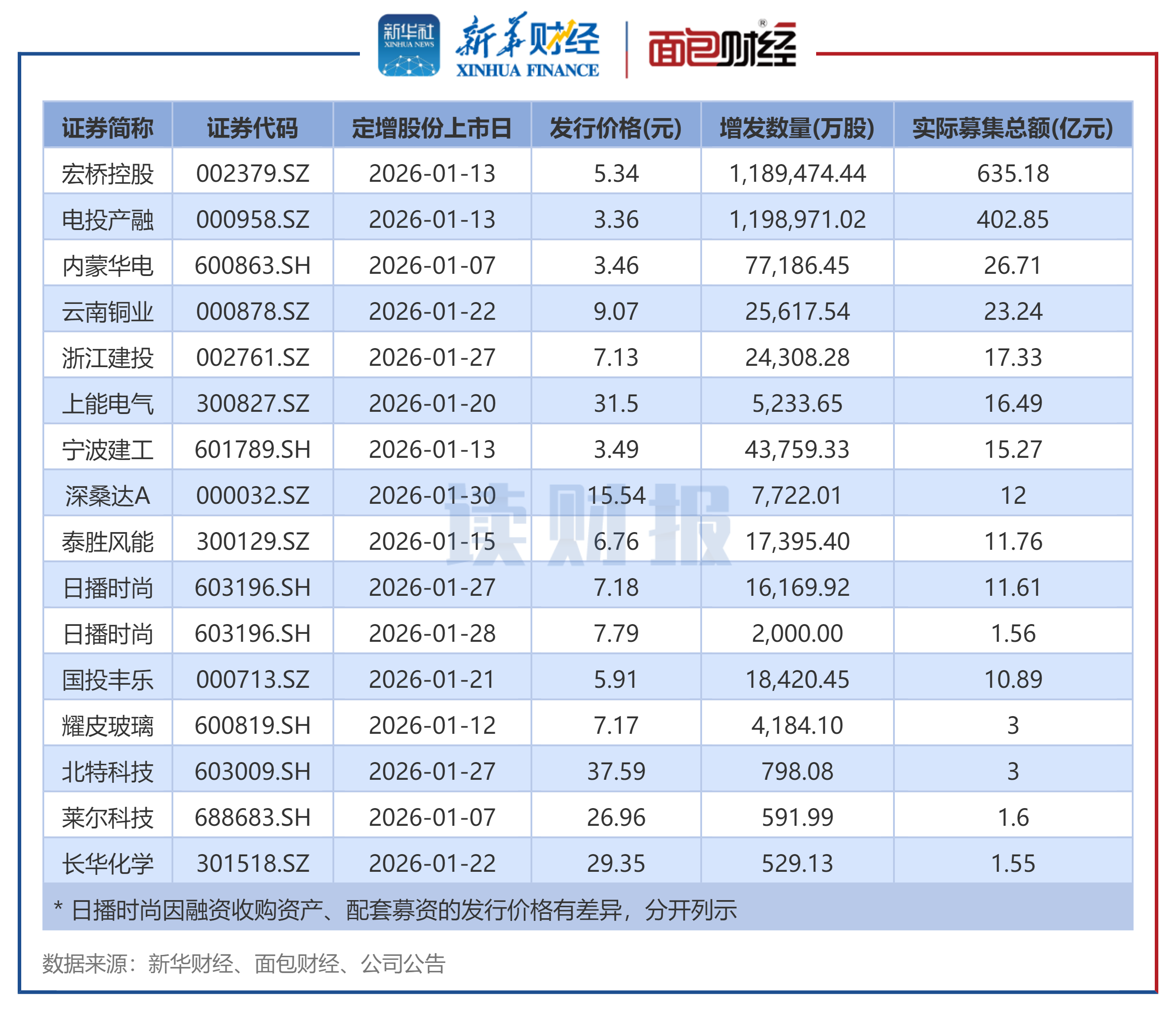 2026年1月实施定增的上市公司中,宏桥控股的实际募资额排在首位。宏桥控股新增股份数量为118.95亿股,发行价格为5.34元/股,实际募资总额为635.18亿元,募集资金净额拟用于购买山东宏拓实业有限公司100%股权。