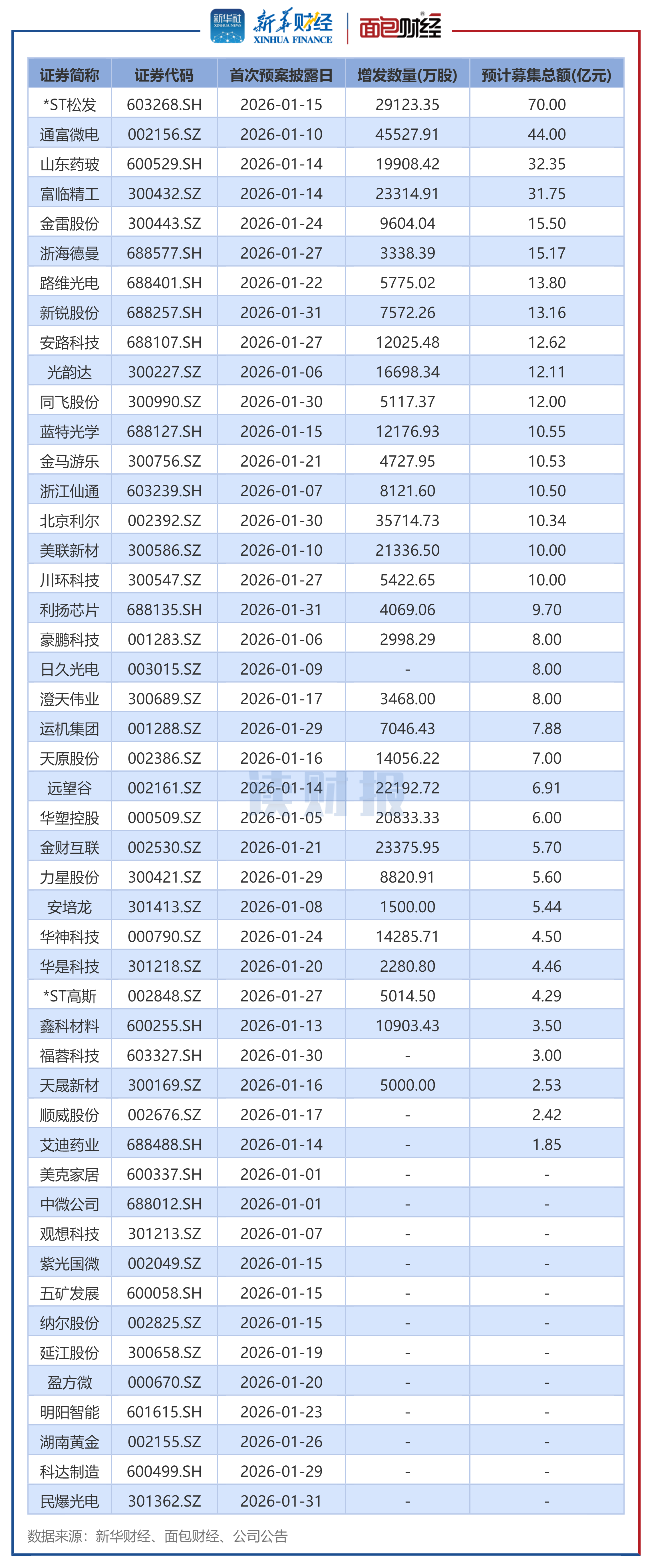 按照首次披露预案日口径统计,2026年1月A股上市公司定增预案发布数量共计48起,拟募资规模约439.16亿元,同比下降51%。其中,*ST松发、通富微电等企业拟募资规模相对靠前。