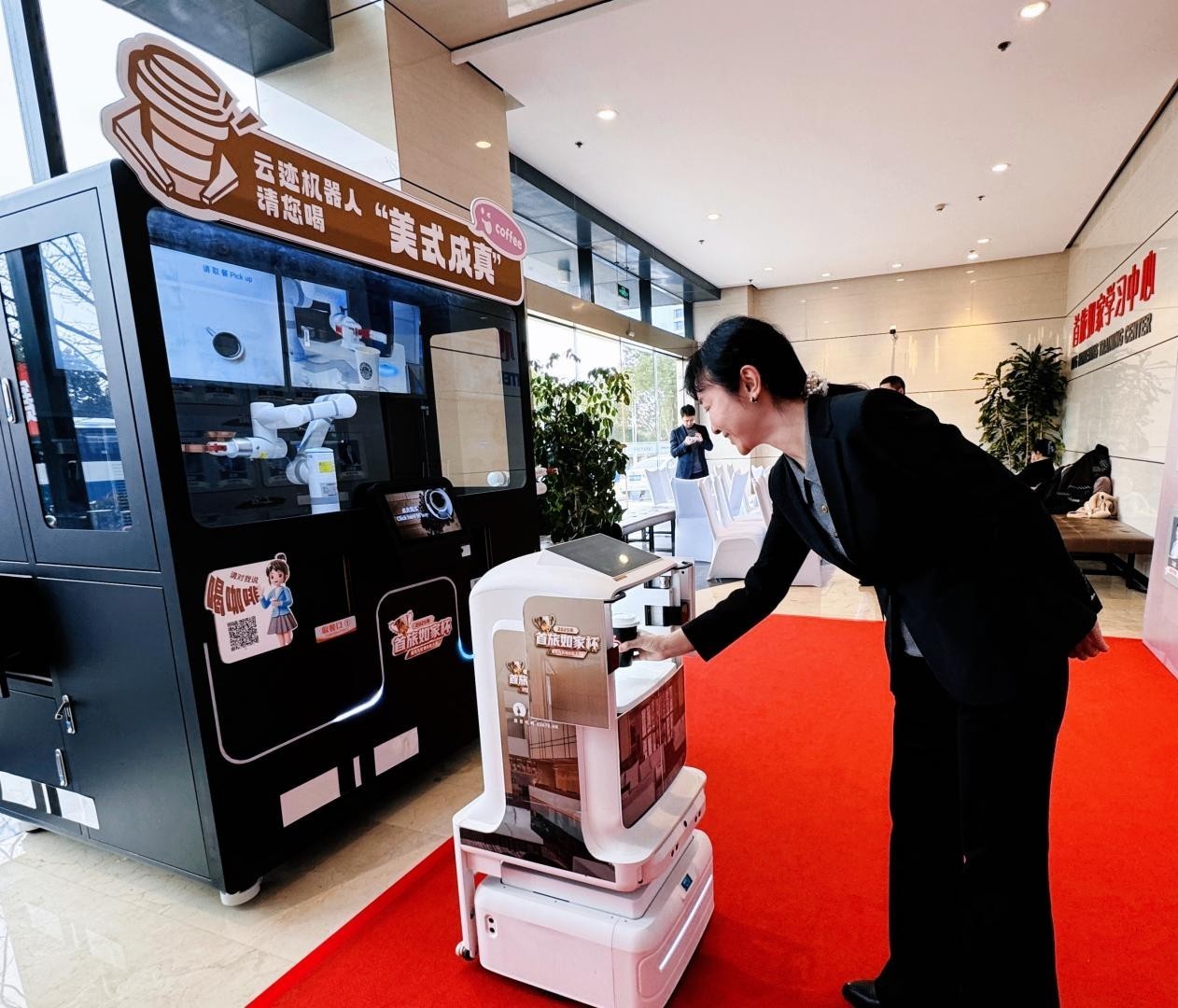 茶饮展区弥漫着醇厚的豆香,咖啡机器人正上演一场科技魔法:从自动取杯、精准研磨到智能萃取、密封盖杯,每一道工序都行云流水,无需人工干预。制作完成后,云迹UP机器人轻灵接力,精准完成“制作—取餐—配送”的自动化服务闭环。这一场景可实现 7×24 小时不间断响应,正成为酒店提升宾客愉悦感、温暖旅途时光的重要抓手。