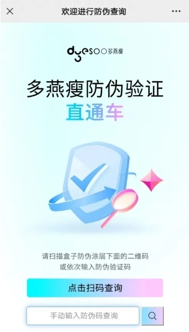 为从根本上遏制假货与诈骗,多燕瘦持续迭代防伪技术,构建全链路保障体系。目前多燕瘦已经建立了上市产品跟踪监控信息系统 ——产品溯源防伪码。实现产品从原料、生产过程、运输至顾客全过程的追溯。消费者可在官方渠道或者“多燕瘦Dyesoo”官方公众号进行防伪查询;另外,品牌在多个销售渠道均设置有官方销售通道,包括京东、天猫、抖音等平台,均有多燕瘦官方旗舰店,消费者可以通过店铺资质、是否有品牌授权等初步判断产品真假,进行选购。