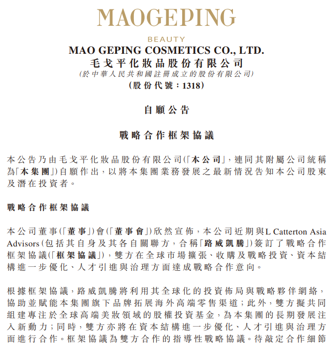 [摘要] 2026年1月7日,MAOGEPING在港交所发布公告,宣布与路威凯腾达成战略合作,双方将在全球市场扩张、战略投资、资本结构优化等多方面深度协作,标志着这家深耕东方美学的国货美妆品牌,正式迈向全球化发展新阶段。