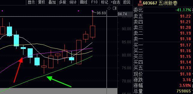 这个五洲新春也是中线的,5个阴线洗盘30日线没有跌破《绿色箭头指的那条绿色线,就是30日线,也是长线生命线》洗盘一周折磨掉散户后,忽然涨停启动,下午继续大涨9.8%新高过前面第一波洗盘位置,回头看没有耐心持股的就容易被洗出局了