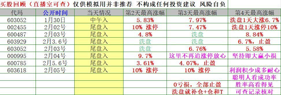 1月至今,总共更新关注和买过的股,回头看,仅2个没有涨回成本外,其他的都有大涨或是涨停新高,弱的无非就是洗盘2--3天后大涨,所以洗盘要开心高兴底仓不高自然敢补仓,坚持必然大赢小损,利润积少成多。