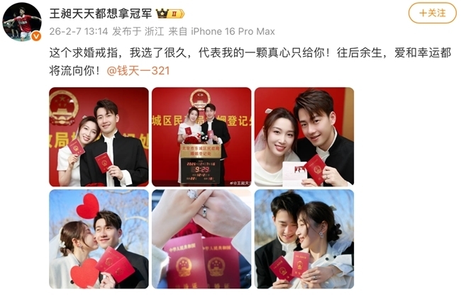 这场精心准备的官宣,处处藏着甜蜜“彩蛋”。王昶特意选择谐音为“爱妻日”的2月7日,并在13:14这一时刻郑重公布喜讯,将对婚姻“一生一世”的祈愿,静静封存于这个特殊瞬间。