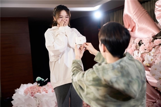 当钱天一步入现场时,眼前的布置令她惊喜不已。当王昶手握DR钻戒小白盒单膝跪地,眼中是藏不住的深情说到:“在一起600多天,聚少离多的日子里,谢谢你始终坚定地陪在我身边。今天,我想把这份陪伴,变成一生一世的承诺。”在“答应他”的欢呼声中,她亦毫不犹豫地回应“我愿意”。