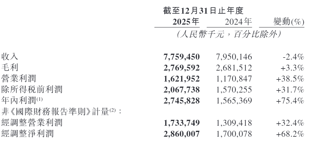 公司近期披露的2025年业绩显示,公司2025年实现收入77.59亿元,同比下降2.4%。但得益于在线音乐服务收入的稳健增长及递延所得税抵免等因素,年内利润同比大幅上升75.4%。
