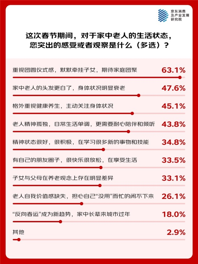 调研显示,在这次春节假期期间,47.6%的人觉得家中老人“身体状况明显衰老”;但积极的方面是,老人们的健康管理意识正在不断觉醒,45.1%的老人会主动关心身体状况,格外重视健康养生,从过往的被动治病转向主动养护,健康是他们生活的第一关切。