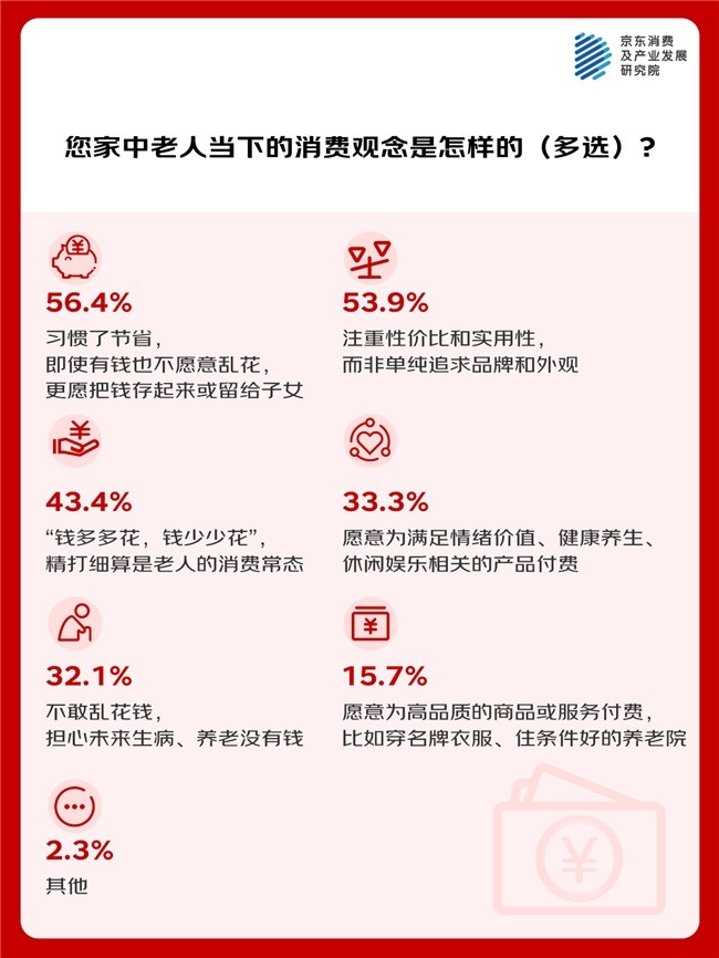 从消费观念来看,更多父母长辈们呈现出鲜明的“守变并存”特征。调研数据显示,56.4%的老人“习惯了节省,即使有钱也不愿乱花,更愿存钱或留给子女”;53.9%的老人注重“性价比和实用性”,而非品牌或外观;还有43.4%的老人持“钱多多花,钱少少花”的弹性消费态度,但消费决策的核心准则依然是“精打细算”。传统节俭观念、对未来的不确定性(如医疗、养老风险)及为子女留的意愿,是驱动储蓄行为的主因。与此同时,在父母长辈中,部分新兴消费需求显现:33.3%的老人愿为“情绪价值、健康养生、休闲娱乐”付费,但高端消费(如名牌、高端养老院)接受度仅 15.7%。这种变化标志着老年群体的消费正从单纯的“生存型消费”向“品质发展型消费”延伸。