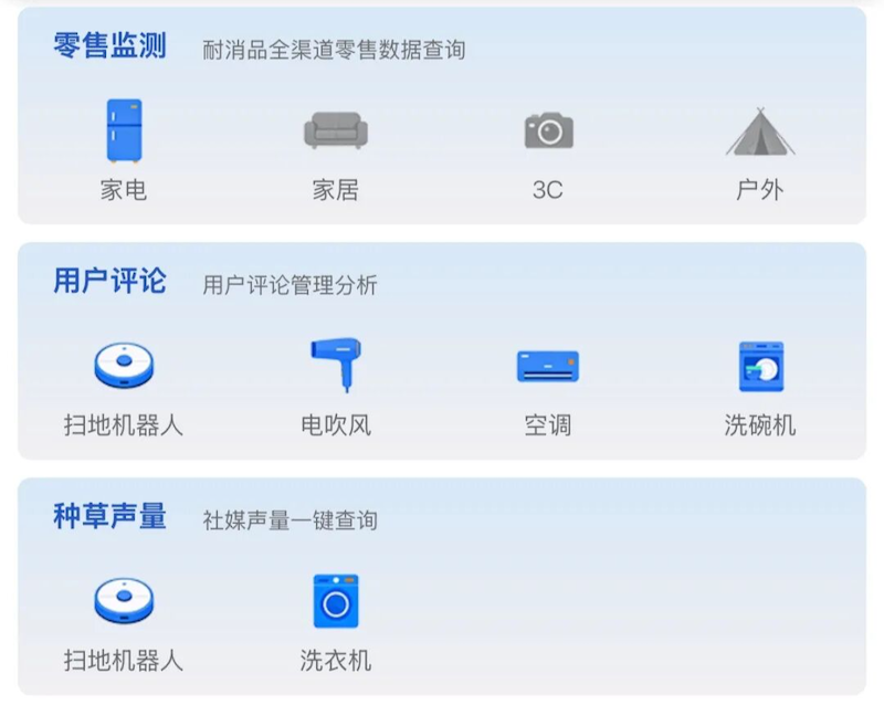 零售监测数据:帮助企业在查询基础上挖掘跨品增长新机会。本次零售监测数据不再局限于家电品类,而是从原有的家电数据扩展至家电、家居、3C数码、户外运动4大零售领域,200+细分品类,所有数据源自真实销售数据,无论是分析自身企业发展,还是寻找跨界的机会,都极具参考性。另外,数据渠道覆盖京东、天猫、淘宝、抖音、快手等五大电商平台,让企业更了解各平台销售信息,合理布局线上市场。
